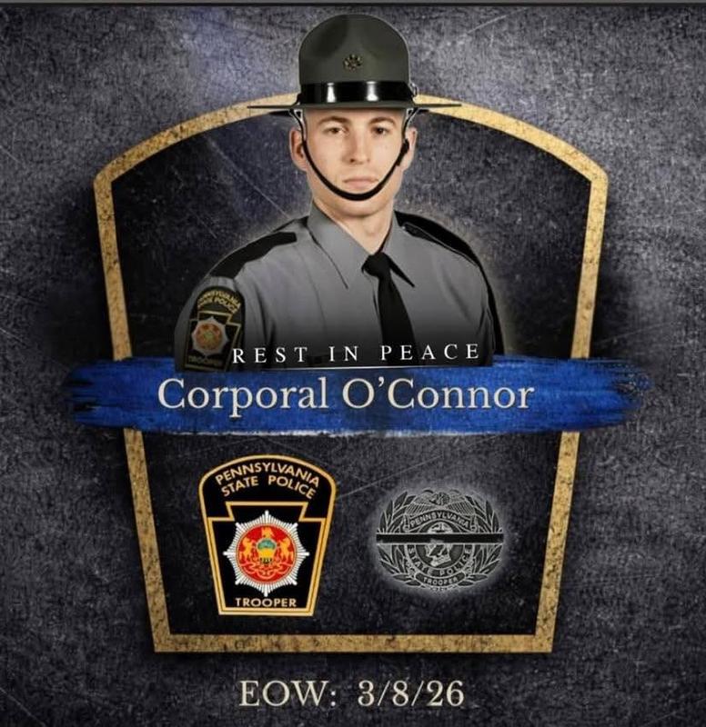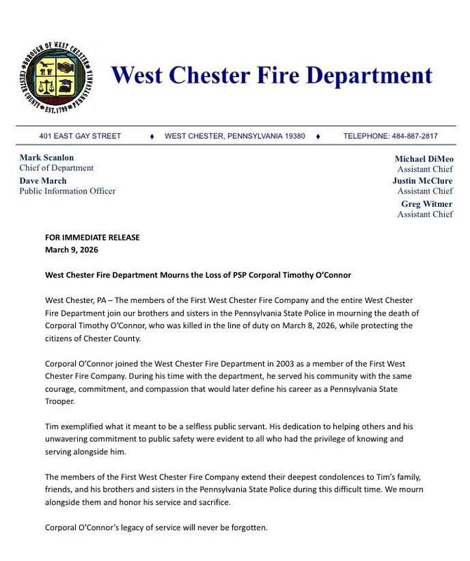 West Chester, PA – The members of the First West Chester Fire Company and the entire West Chester Fire Department join our brothers and sisters in the Pennsylvania State Police in mourning the death of Corporal Timothy O’Connor, who was killed in the line of duty on March 8, 2026, while protecting the citizens of Chester County.